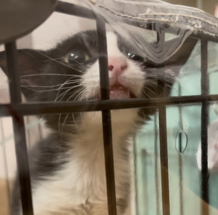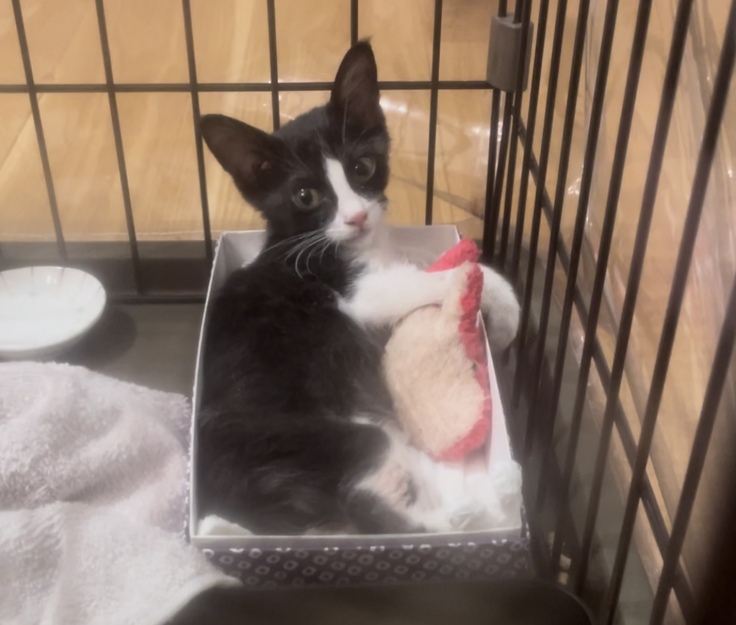 それまでは、酸素室での生活が続いていたものの、相棒のクジラと遊び、段ボールハウスの上に乗ったりして、たまにニャーニャー鳴いていました。(ミルクが欲しい!外に出せ!と言っているのかな?笑)