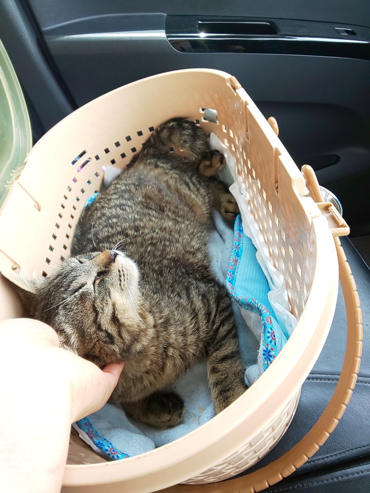近づいて見ると、ほとんど動けず舌が出てしまい口呼吸になっていましたが、近くの動物病院に電話したところ、早朝にもかかわらず対応していただけ、一命を取り止めました。