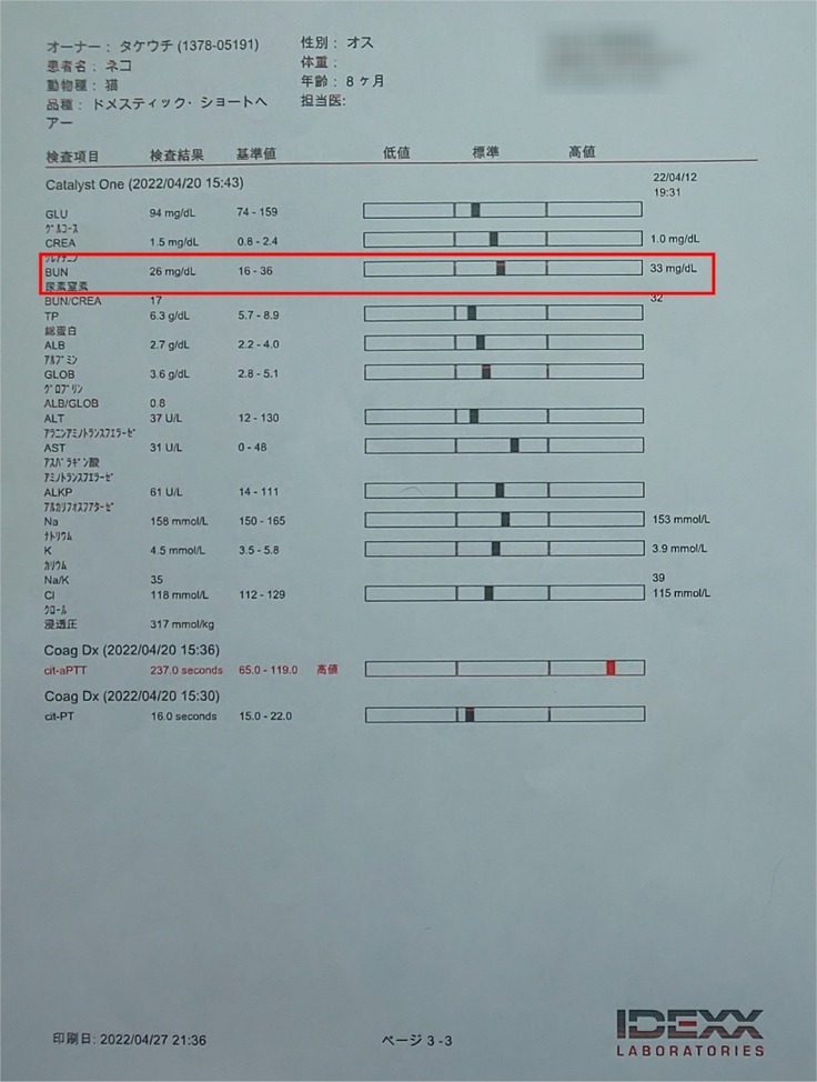 ◆手術翌日の血液検査(BUN標準値範囲内になりましたが、まだ高めです)