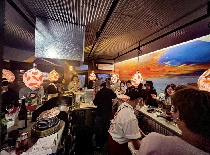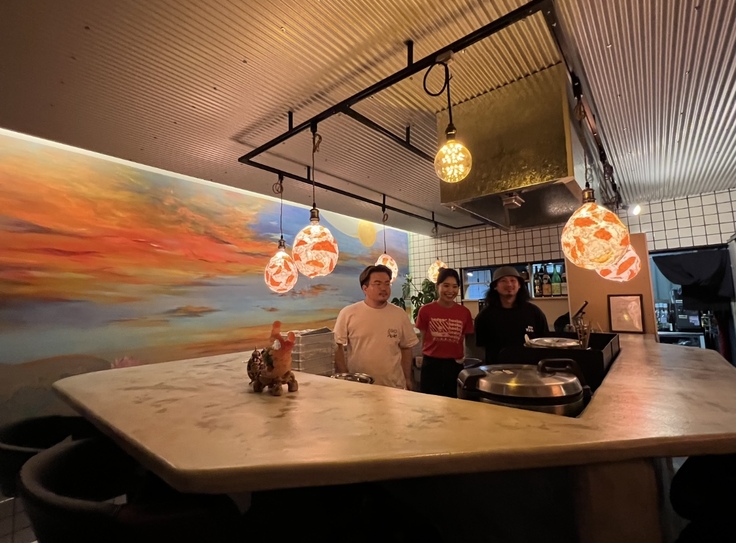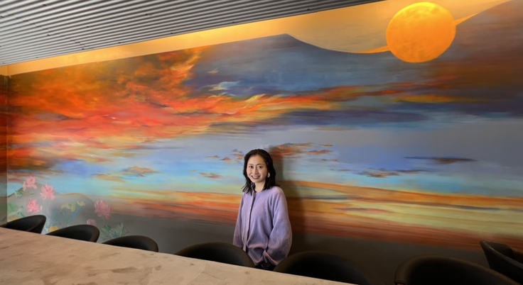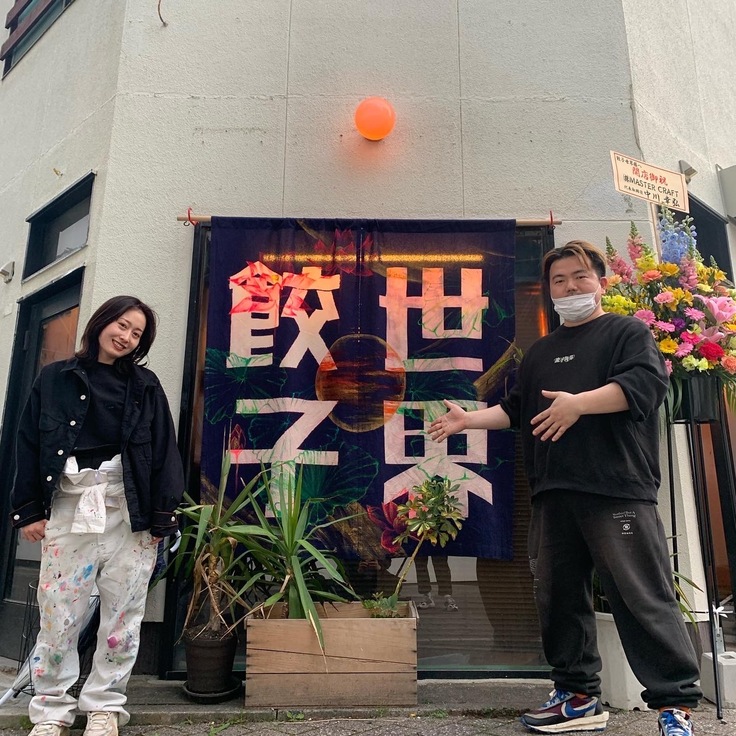 火災に巻き込まれた時、餃子世界東京で代表守屋が出会った日本画家 本城葵様がご好意でプロジェクトに参画してくださり、「記憶と再生」をテーマに店全面の壁と暖簾に絵画を施してくださいました。