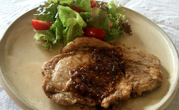 ・豚ロース肉に塩胡椒をしてしっかり熱したフライパンで両面こんがりソテーします。