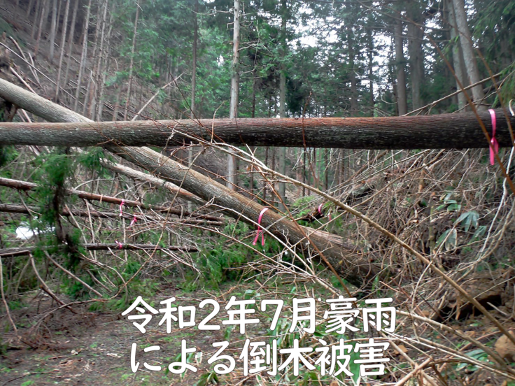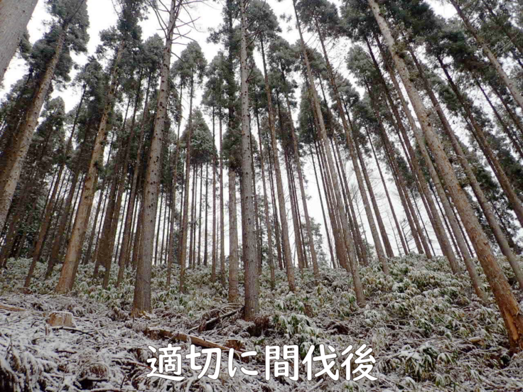 山が荒れると大量の木々が細いまま成長し、地面深くまで根を張らず、ちょっとした風や雪で倒