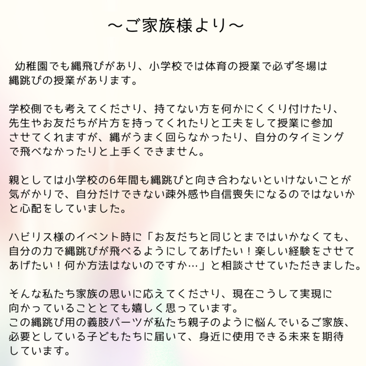 「縄跳び」に悩まれるご家族さまや子どもたちに「縄跳びが楽しい!」「飛べる!」という体験をして欲しいと始めた開発プロジェクトがようやく形になりました。