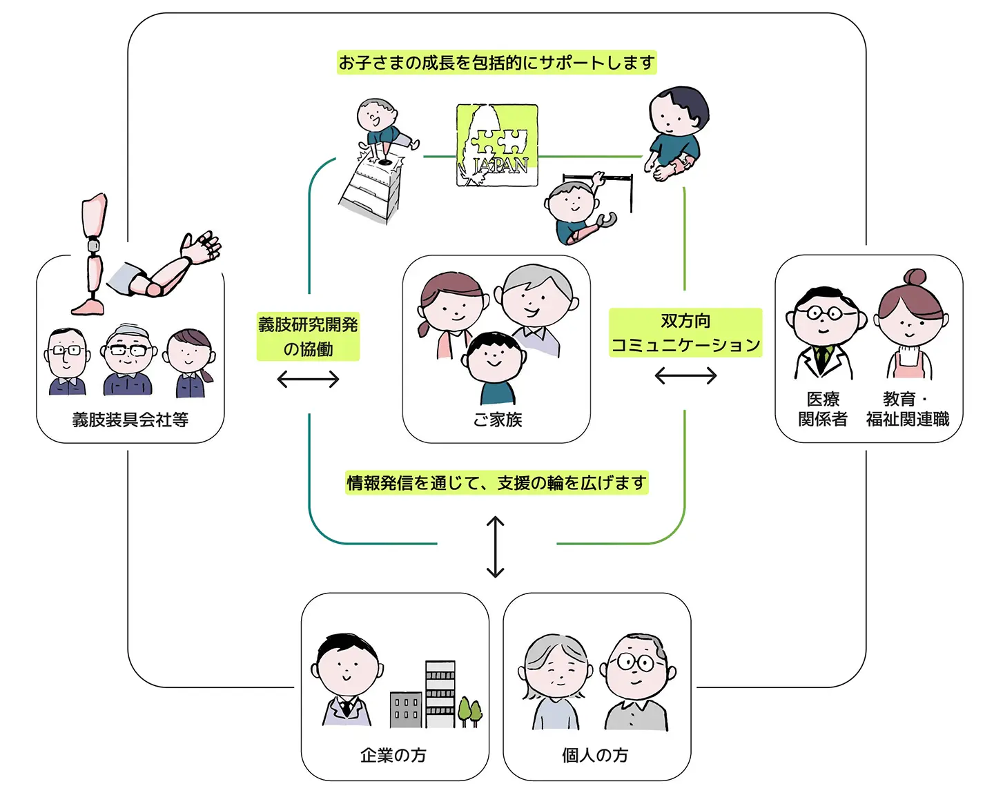 私たちは手足に特徴のある子どもたちの成長を支え、その未来を育むため活動をしています。子どもは、体を動かしたり、チャレンジすることが大好きです。手や足に特徴があってもその気持ちは同じです。友達といっしょに走りたい!鉄棒をしたい!キャッチボールをしたい!そんな時間が 子どもたちの心と体の成長につながります。私たちは、手や足に特徴のある子どもたちの色々な“したい!”を実現するため、場所(イベント開催)や道具(義肢=人工の手足)などを届け、チャレンジするための環境を整える活動をしています。