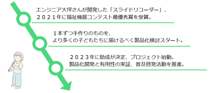 佐賀県在住のエンジニア・大坪武廣さんが、長年の試行錯誤を経て開発したスライドリコーダーは、2021年に福祉機器コンテスト最優秀賞(機器開発部門)を受賞しました。