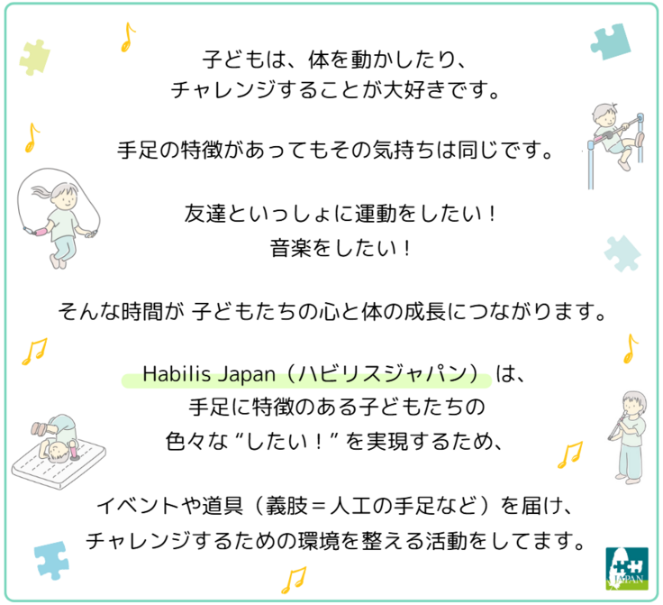 Habilis Japanは、手や足に特徴のある子どもたちを支え、その未来を育むため活動をしています。