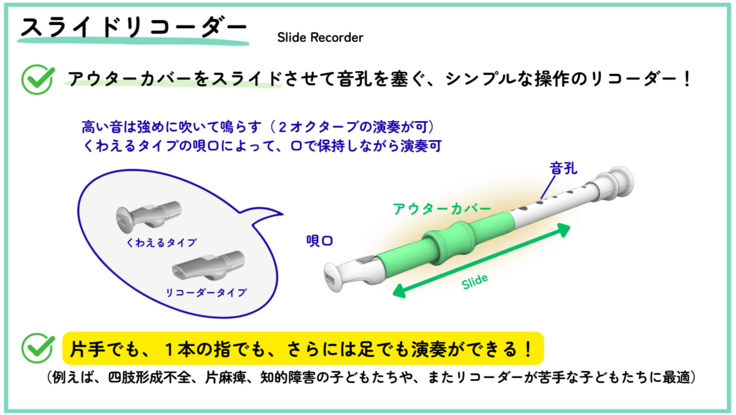 片手でも、1本の指でも、さらには足でも演奏ができるリコーダーです。