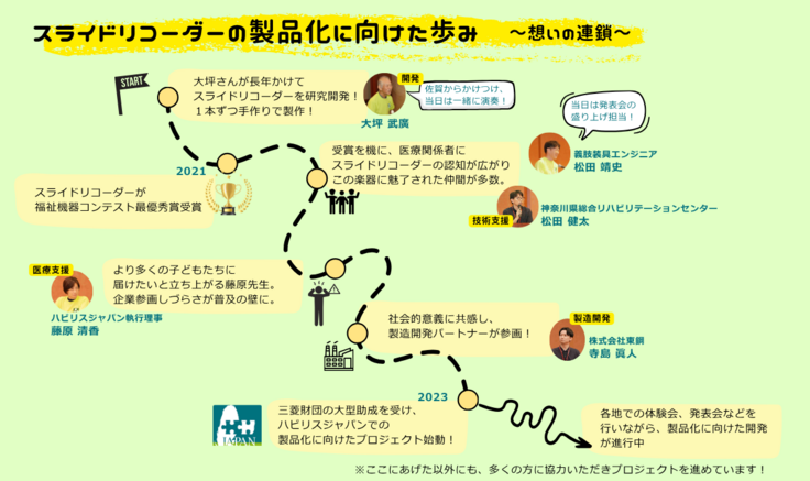 ハビリスジャパンの藤原理事からは、「スライドリコーダーをより多くの子どもたちに届けたい」との想いを抱く一方で、対象となる子どもの数が限られており、大量生産には向かないことから、民間企業にとって取り組みづらいという普及への現実的な壁があったことが共有されました。