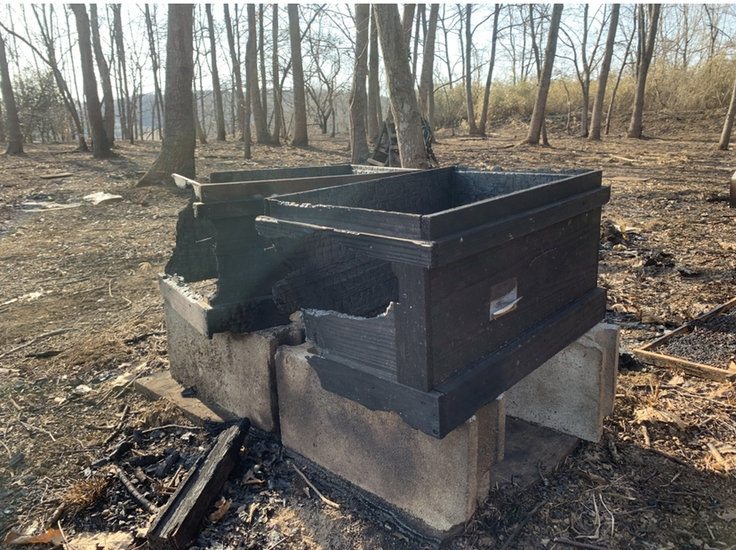 残ったのは、辛うじて一部焼け残った巣箱2箱と、巣箱に使われていた釘と、