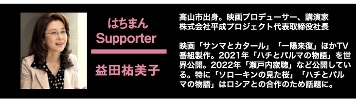 ページをご覧いただき、ありがとうございます。©2022映画「 倉敷物語~はちまん~」製作委員会(株式会社明日絵)代表の三城誠子です。