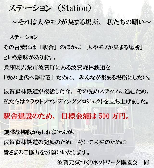 かつて、”大阪営林局のドル箱”と呼ばれ、波賀町の経済を支えた波賀森林鉄道の歴史のバトンを次の世代に渡したい。子どもたちや当時を知るお年寄りの方を喜ばせたいとの思いで、“林鉄復活”の夢の実現に向けて少しずつ前へ進んでいます。子どもから大人まで、たくさんの人々の笑顔と地域の希望をのせて運行できるように、皆様のご支援をいただきますようお願いいたします。
