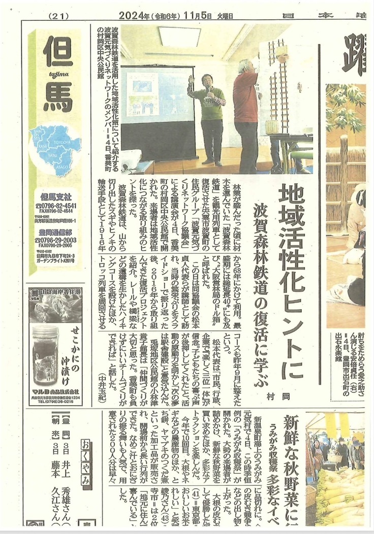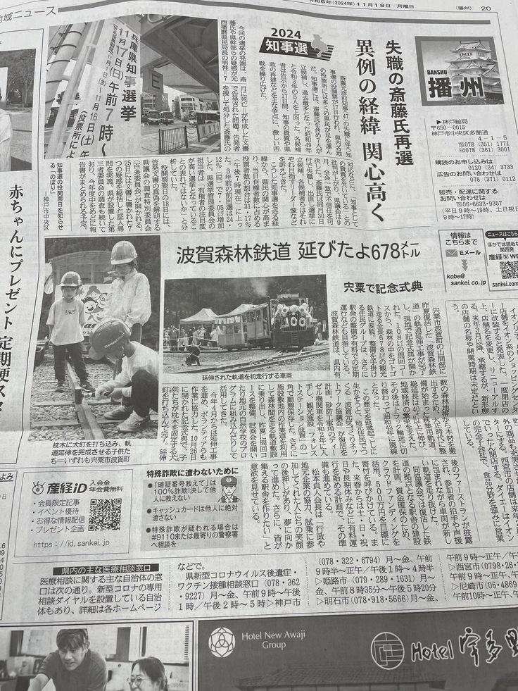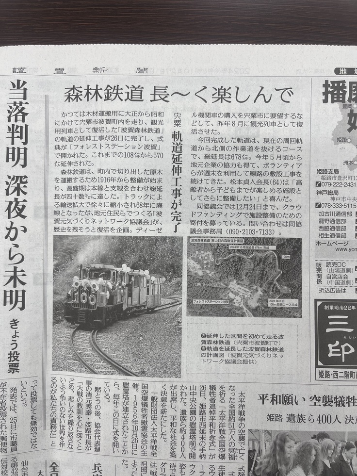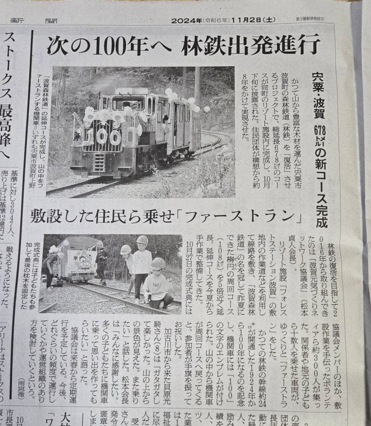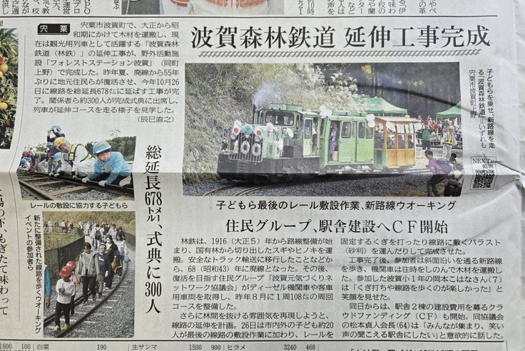 今回は、当クラウドファンディングが始まった「10月26日 678m軌道完成式典」以降に、波賀森林鉄道プロジェクトを取り上げていただいた『新聞』を【 全5つ 】公開いたします。