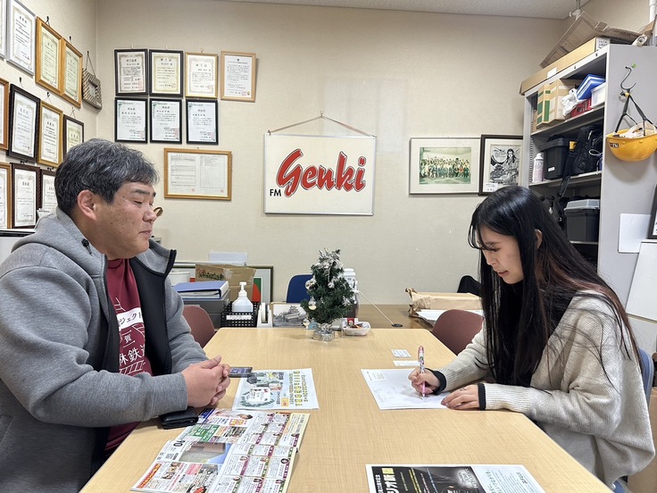 打合せの一コマ。青木さんがパーソナリティの方に質問内容を指示!?