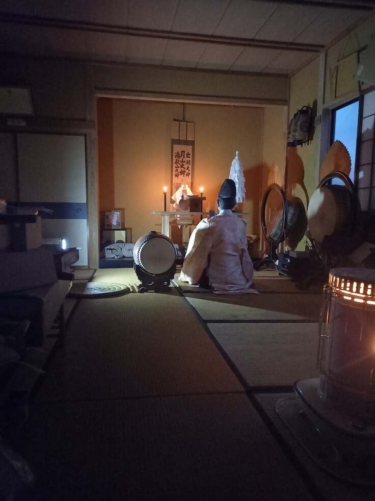 こちらの画像はまだ電気の通っていない環境で、2月1日のおついたち参りのご奉仕を朝の6:30からされている宮司様です。