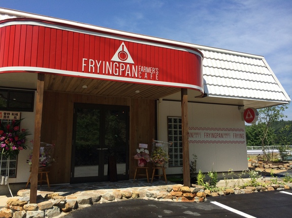 お店の名前は「フライパン」になりました。料理するときフライパンの中で食材が楽しげに飛び跳ねているイメージから名づけました。ロゴや外観のデザインは「りんご」、「赤」、「フライパン」をもとにデザイナーさんに考えてもらいロードサイドで