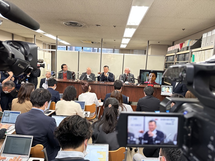 ▲「抗告断念」の一報直後、記者会見する弁護団
