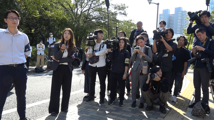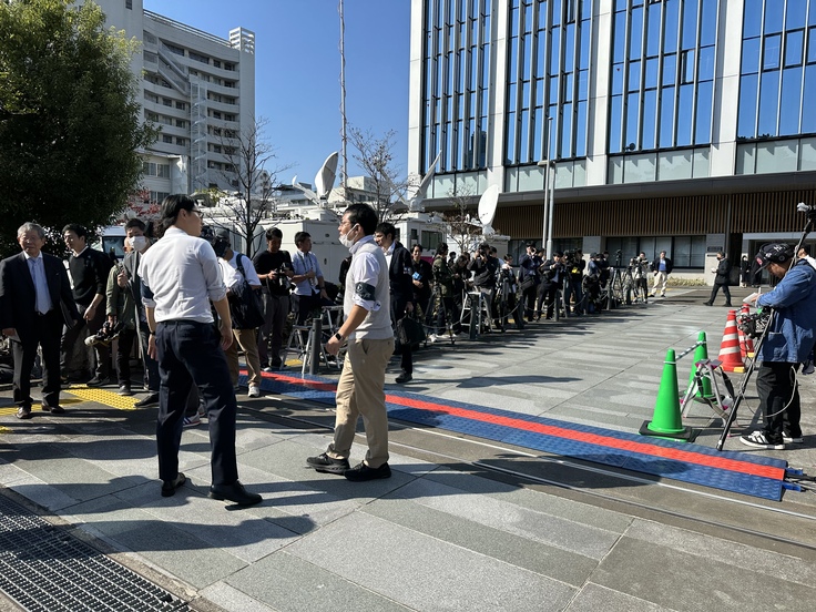 ▲裁判所前で待機する報道陣