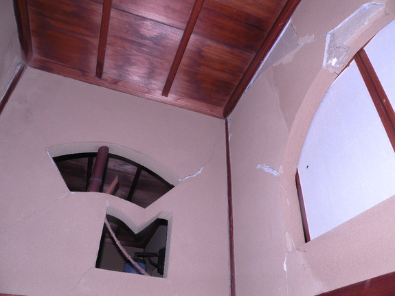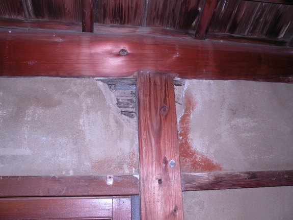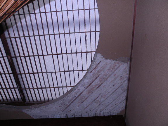 館内のほとんどの入洛壁や漆喰にはヒビが入り、ひどいところでは一面が崩れ落ちました。また、建物に歪みが生じその隙間から雨漏りをするようになってしまいました。