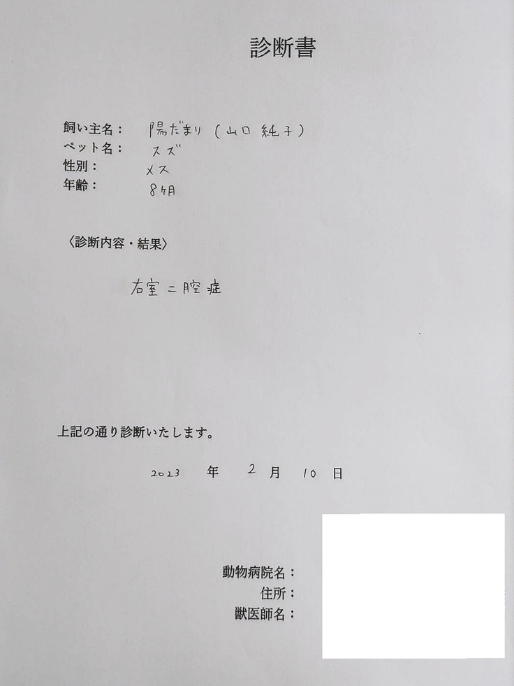 右室二控症(心臓病)を抱えたスズ(陽だまりが看護飼育中)※動物病院より診断書掲載許可済