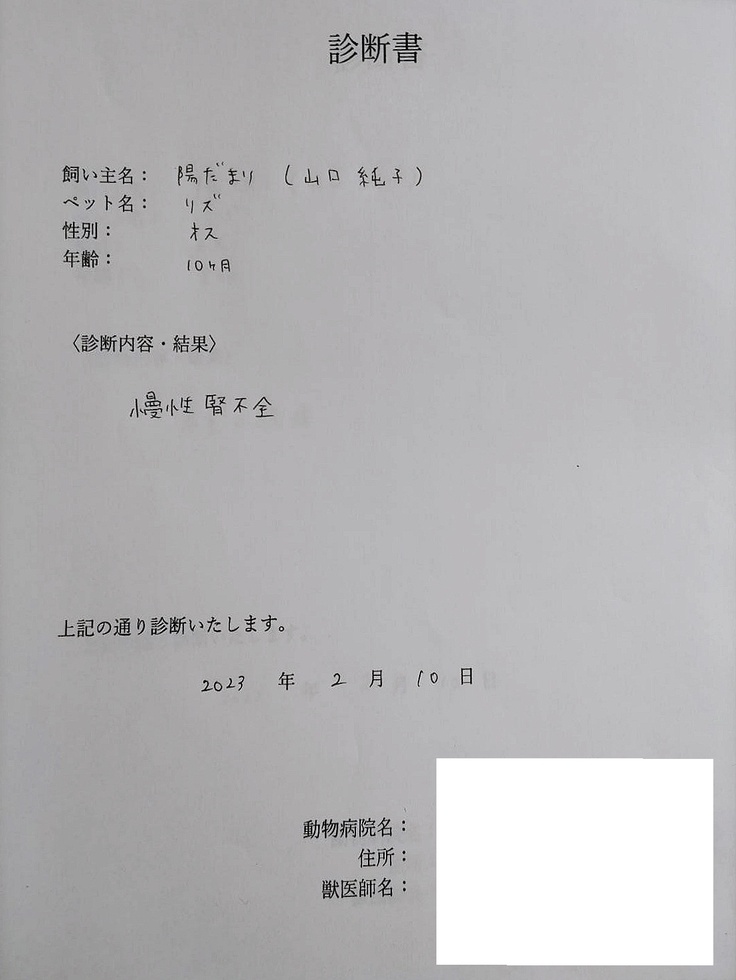 リズもまた、これからも在宅での点滴が必須であり、飼育していく以上は治療を継続していかなけれななりません。