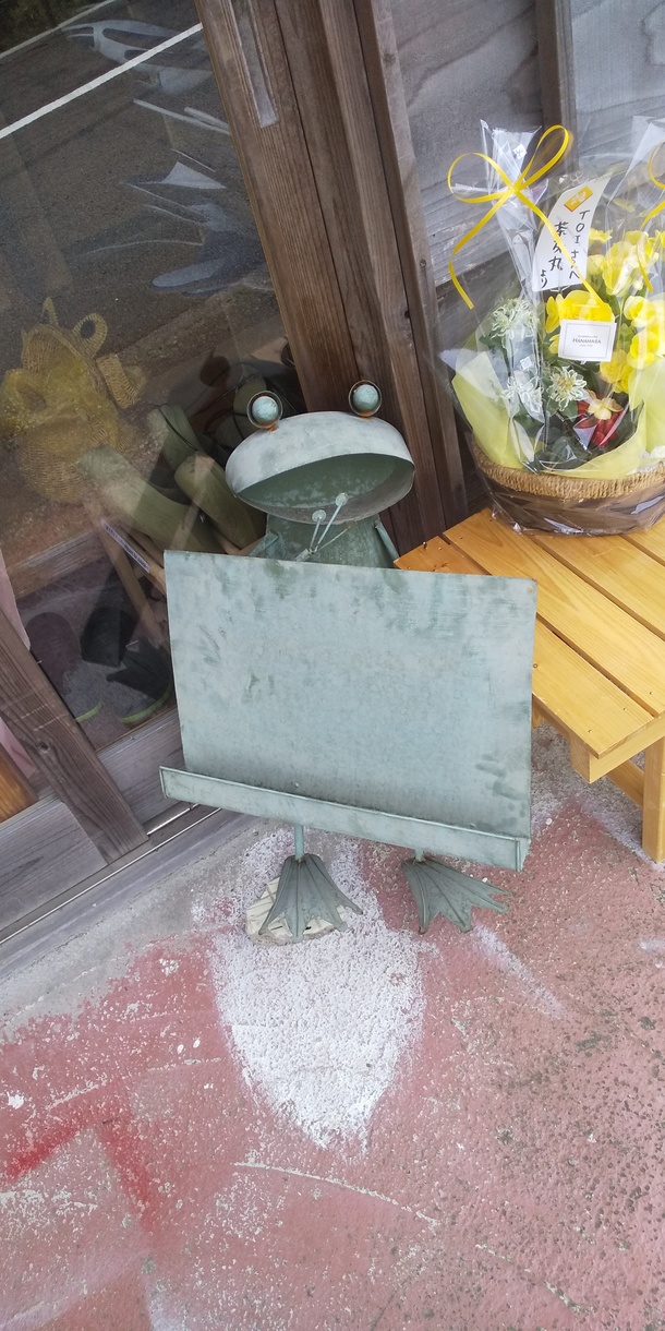 今日は暑さこそそれほど、ですが風が強い!入口にあるマスコットキャラクターのカエル君も何度も倒れております!笑