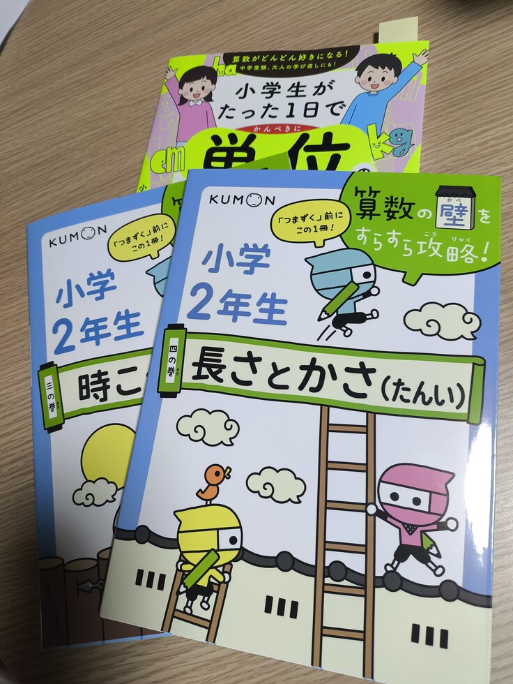 そこで、「KUMON」シリーズの 小学2年生向け教材『長さとかさ』や『時こくと時間』を追加購入して試してみました。これらはとても簡単なところからスタートできる内容で、子どもたちも無理なく取り組むことができたようです。「わかった!」という表情を見せる子どもたちの笑顔を見ると嬉しい気持ちでいっぱいになります。