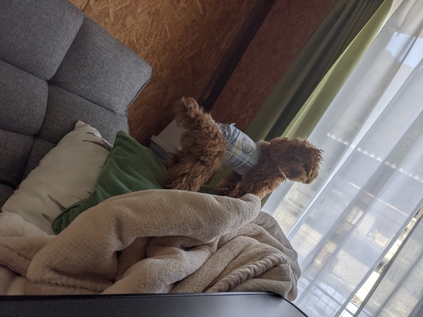 エリザベスカラーは狭い家でカツカツ当たるのと嫌がるので外してマナーベルトを二重にしています😅