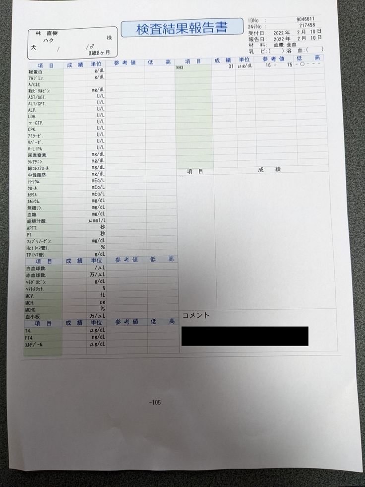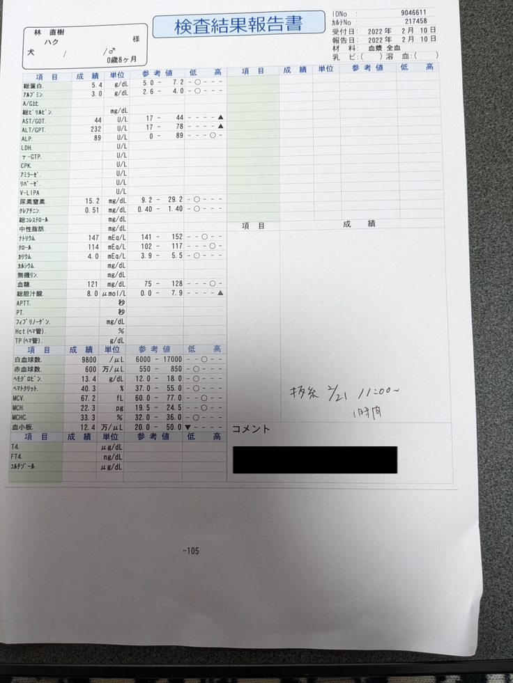退院朝の血液検査の結果です。血糖値が心配されていましたが、下がってきているので問題はないであろうということでした。総胆汁酸もまだ肝臓は十分ではないのと尿に砂が今も混じっているのもありますが回復傾向ということです。アンモニアの数値も安定しています。