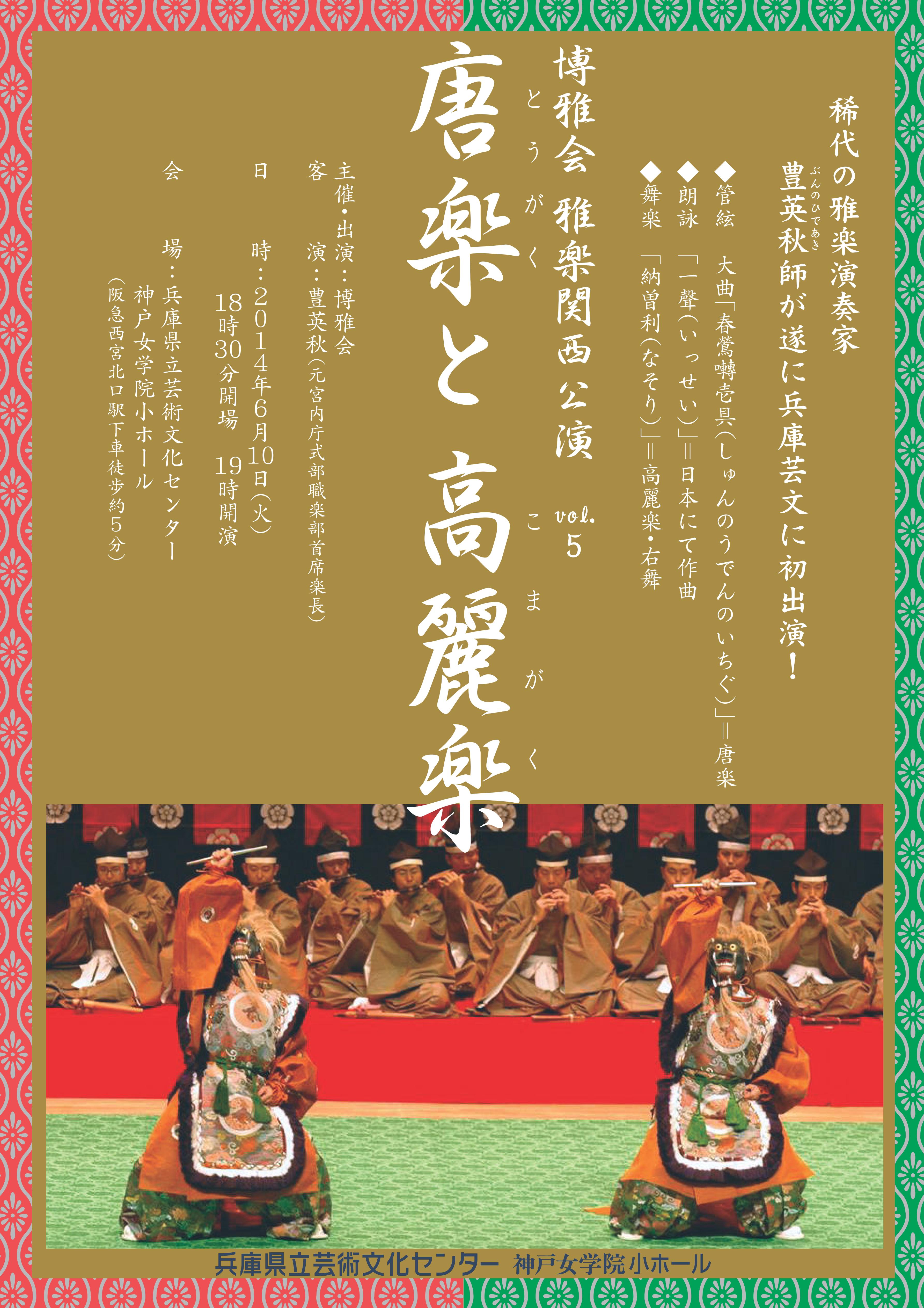 ③6月10日に開催されます「博雅会関西雅楽公演vol.5「唐楽と高麗楽」特別招待券をお送りします。尚、当日は本来自由席ですが、特別に御来賓としてお席をご用意させて頂きます。