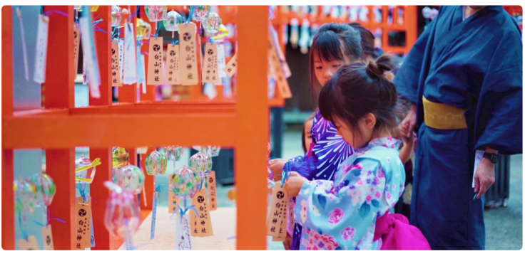 「七夕風鈴まつり」は霊峰白山の開山1300年を記念して、2016年より始まった祭事です。古来より鈴の音は心身を清め邪気をはらう力があるといわれています。境内には1000個以上の風鈴を吊るし、その音色で厄をはらい、願いが風に乗って、神様に伝わりますようにとの願いを込めて。