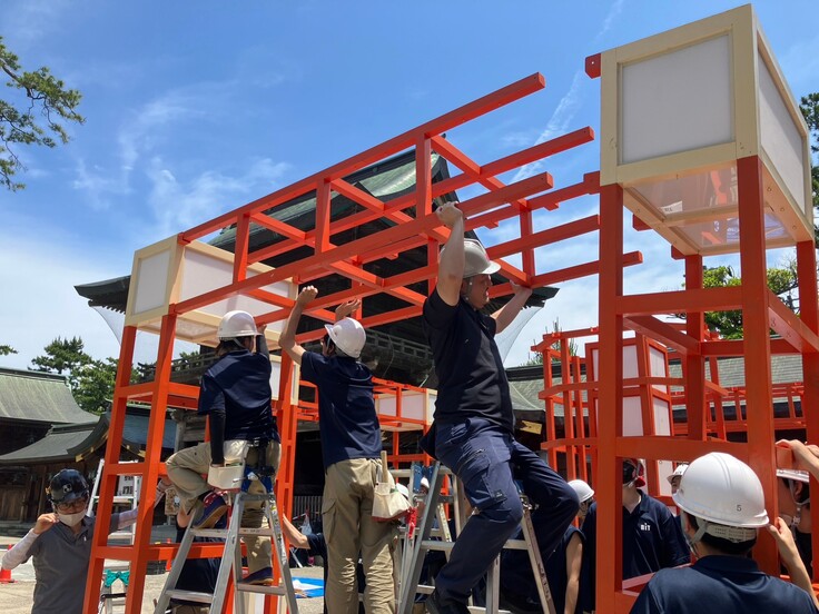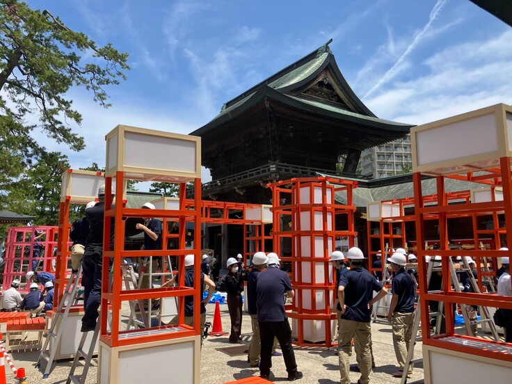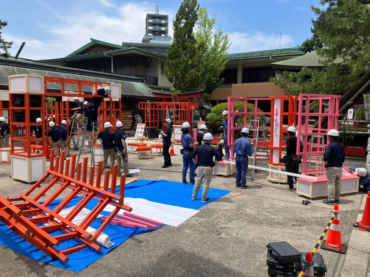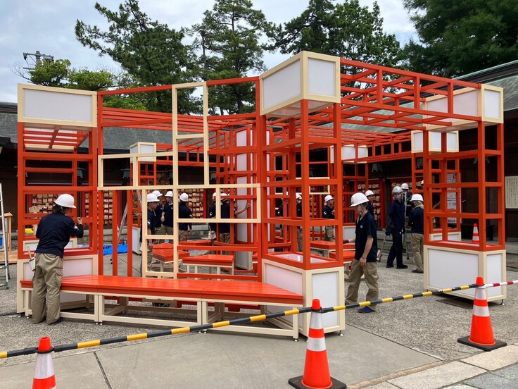 本日、業者さんと学生さんによって境内で什器の組み立てが行われました。