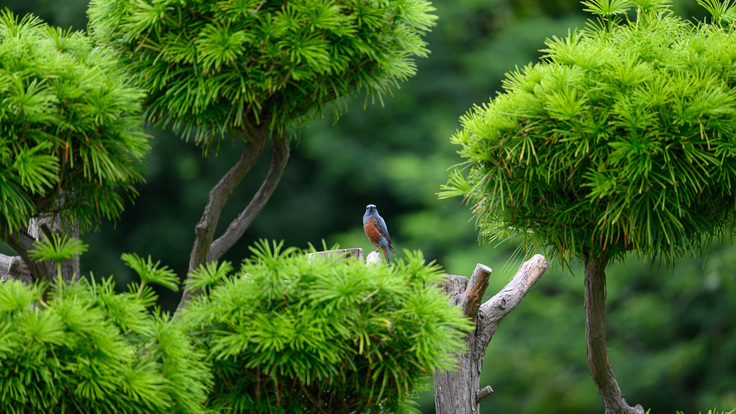 庭に幸運の青い鳥と言われるイソヒヨドリ