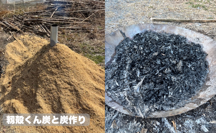 同時に伏せ込みの時に使う籾殻を炭にした籾殻くん炭(左)と