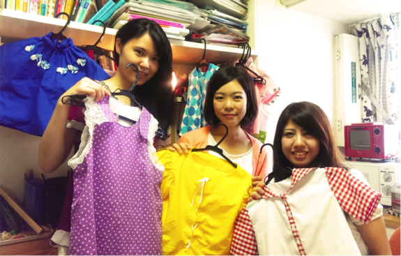 ↑HALLE企画メンバー(右から桃香、美和、瑞葉)、子供服と。美和の部屋にて。