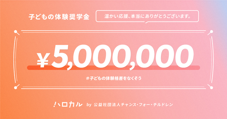 7月4日より開始しました「『体験格差』をなくすため、 全国の子どもに『体験奨学金』を届けたい」について、本日8月1日に目標金額2,000万円の25%となる、500万円を達成することができました!