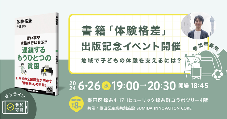 本イベントでは、著者の今井より「体験格差」の実態についてお話するとともに、地域で子どもの「体験」を支えるために活動するゲストとのトークセッションなどを予定しています。