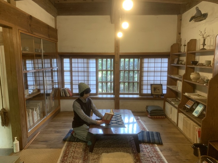 濱田がリーチ氏の来日の際に、工房と寝室として古民家を近隣から移築したもので、正面から見て右側が寝室、左側がろくろが据えられた工房。そのこじんまりとした落ち着く寝室部分を誰かれともなくいつの間にか、