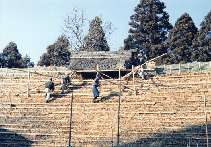 でも、茅葺きは次の日から村人がみんな集まってきて、ちょうど秋だったから藁とか茅が青いけどあったんだ。