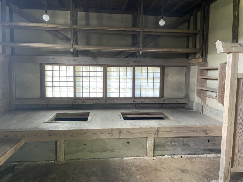 細工場も補修が終わり元の姿へと。壁の中塗りと漆喰は屋根が終わってからだそうだ。ロクロ台の小さい穴が濱田庄司が使った。大きな穴がリーチの使ったロクロ台。丁度濱田とリーチが向かい合わせで仕事をしたそうだ。