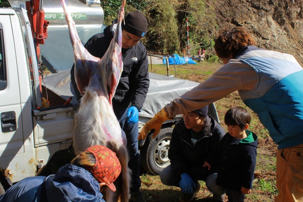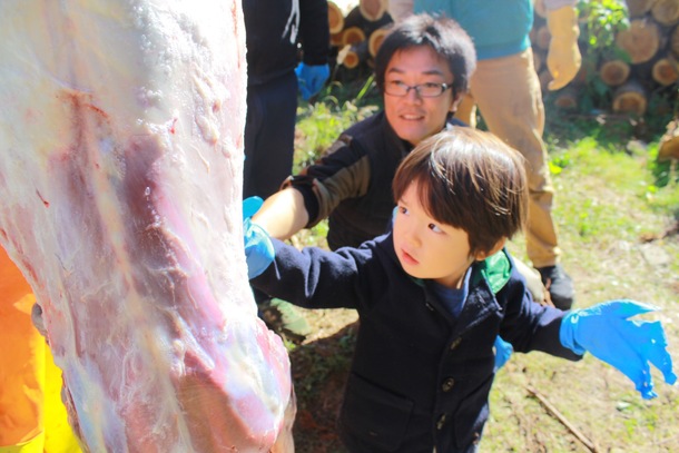 逆さに吊るし皮を剥いでしまうと「鹿さんはどこ?」とすっかりお肉としての認識に変わったようでした。