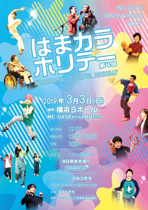 「はまカラホリデー」は、障がいがある人もない人も、子どもも大人も、男の子も女の子も、おじいちゃんおばあちゃんも、みんな一緒にダンスと音楽で盛り上がろうという参加型イベントです。皆さまのお越しをお待ちしております。