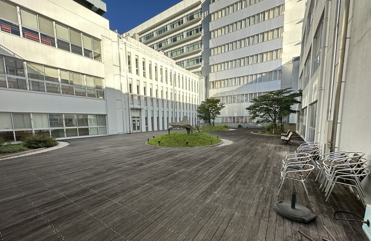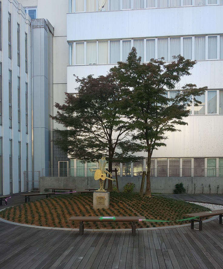 11月3日、外来棟中庭の改修工事がスタートしました。改修工事では、モニュメントの周りの植物を植え替えてベンチや安全柵、オーニング(日よけ)等を設置し、出入口を自動ドアに変更する作業を実施します。工期は12月下旬までの予定です。