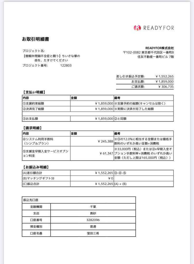 直接支援へのお礼とお受け取り額のご報告