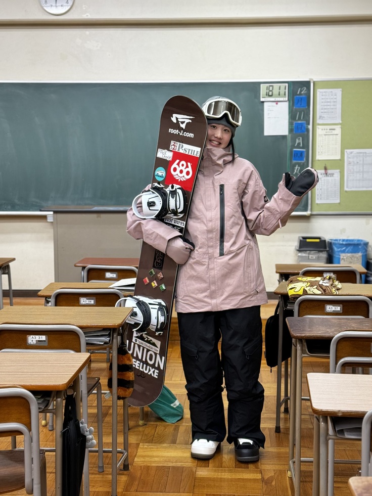 いつもの教室でスノーボードの格好はちょっと面白かったです😅