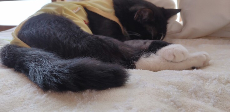 やっとのお昼寝も、顔がガクンと揺れたりピクピクしたり、尻尾ぶんぶん、手足もビクビクッと、数分で起きて体勢をかえるの繰り返しでした。