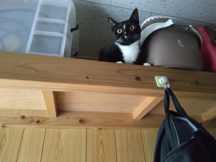 物置で捜し物していたら、天井棚に😱脚力は健在🐾