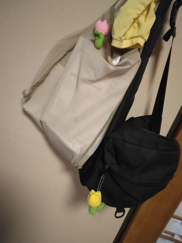はなちゃんと私の病院バックにチューリップ🌷がつけられてました。ダサい…😂