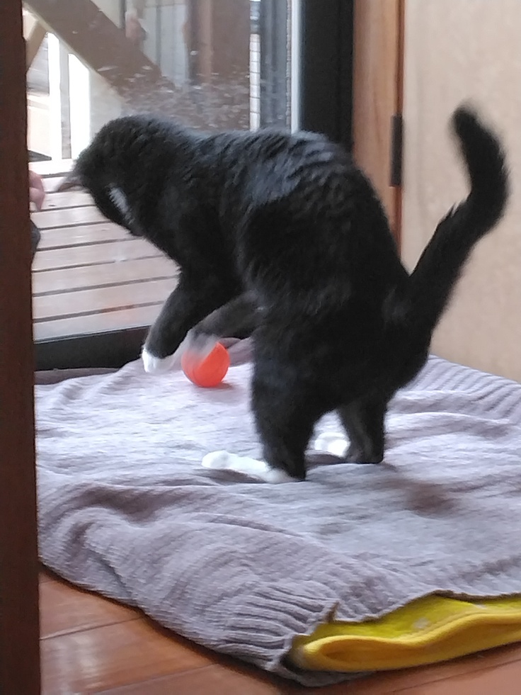 スッキリしていつもなら寝てくれるけど、外からちゅーるおじさんが『はなちゃんはなちゃん』とボールを投げ込んできました😑