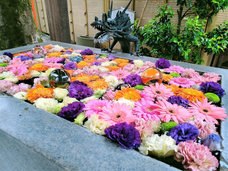 手水は、日本の美しい寺社文化を代表する様式の一つです。ちなみに花手水は、手水舎に鑑賞用の花を浮かべたもののことを言います。