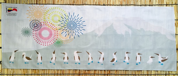 プロジェクトのロゴ、そしてアオアシカツオドリの手ぬぐい、うちわのデザインにも描かれている山はエクアドル最高峰の山(海抜6,310m)、チンボラソ山です。